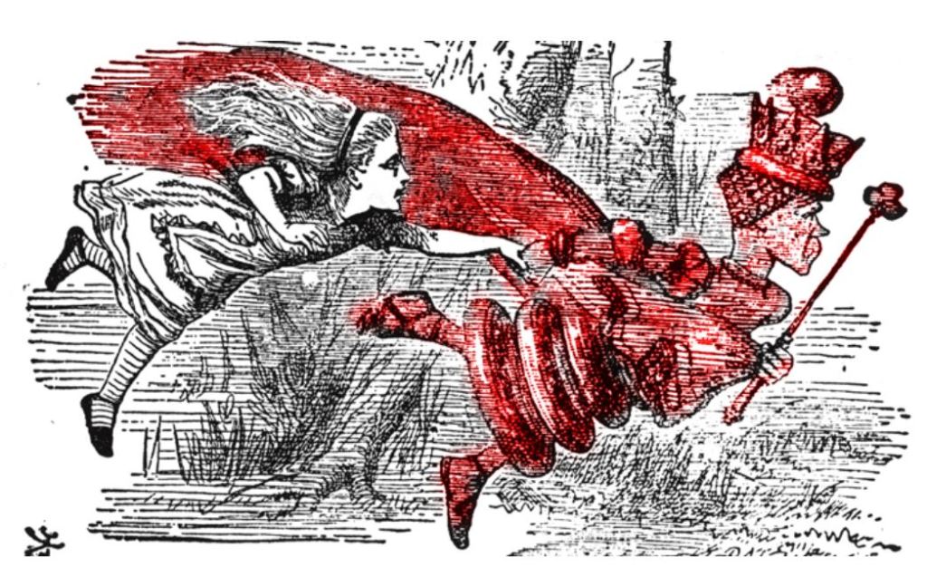 ‘Well, in our country,’ said Alice, still panting a little, ‘you’d generally get to somewhere else — if you ran very fast for a long time, as we’ve been doing.’