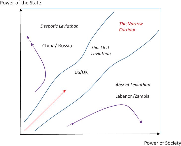 A country like Congo or Somalia has no perceivable State. Such regions are under the spell of the Absent Leviathan. Countries like China and North Korea have an extremely powerful State apparatus and can be categorized as the Despotic Leviathan. Between these two lie a narrow corridor wherein lies the modern liberal state in the form of the Shackled Leviathan.