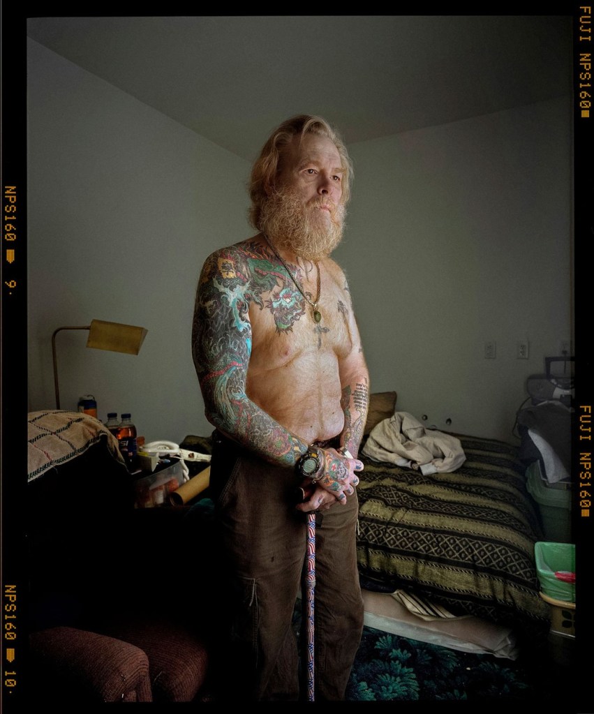 Leroy found Wike in Prescott, Arizona, in bad shape but delighted to see her again. He looked much older than his 58 years. On his body were 19 warrior tattoos, including the names of comrades who had died in Vietnam. He had burned through four marriages and had two sons who wouldn’t speak to him. Once, after he had collected a horde of weapons, he had an armed standoff with police at his remote cabin. Later, the cabin burned down, and Wike lived alone in a tiny room in town when Leroy found him. Two days after she photographed him, he had a stroke that blinded him and paralyzed half his body. He died soon after. It was Catherine Leroy’s last commission. She died a year later in California, age 61.