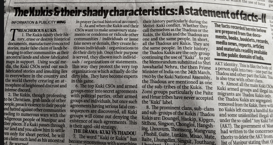 Manipur has always been a tinderbox due to its ethnic composition. The Meiteis, Kukis, Nagas and the Muslims form the main ethnic groups. But the concentration of the Meiteis in the Imphal valey and the rest of the tribes in the Hill districts, the historic Naga-Kuki tensions and the excessive claims of the Meities on development funds form the crux of the issue. From what I heard, today for any domestic travel within India, the Hill tribes now rely on choppers to bring them to the Imphal airport as the roads are still considered ‘unsafe’. The ongoing tensions was best exemplified by this piece in the Edit page of today’s People’s Chronicle – a Meithi newspaper that was slipped into my hotel room. I haven’t seen anything like this in any newspaper in India.